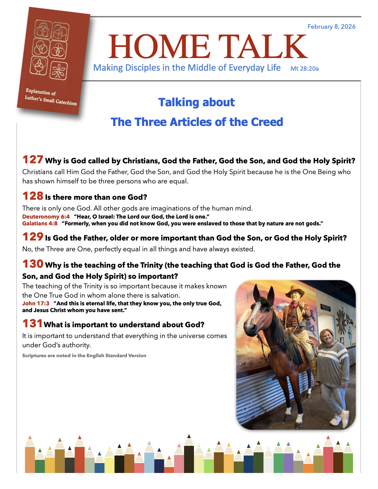 Reading and discussing your weekly edition of Home Talk is a great way for you to continually review the foundational teaching of scripture. Each page of Home Talk features a short segment of The Explanation of Luther’s Small Catechism.